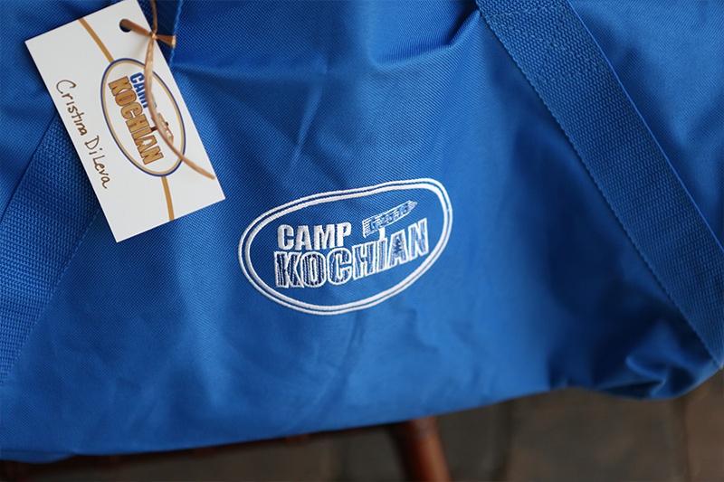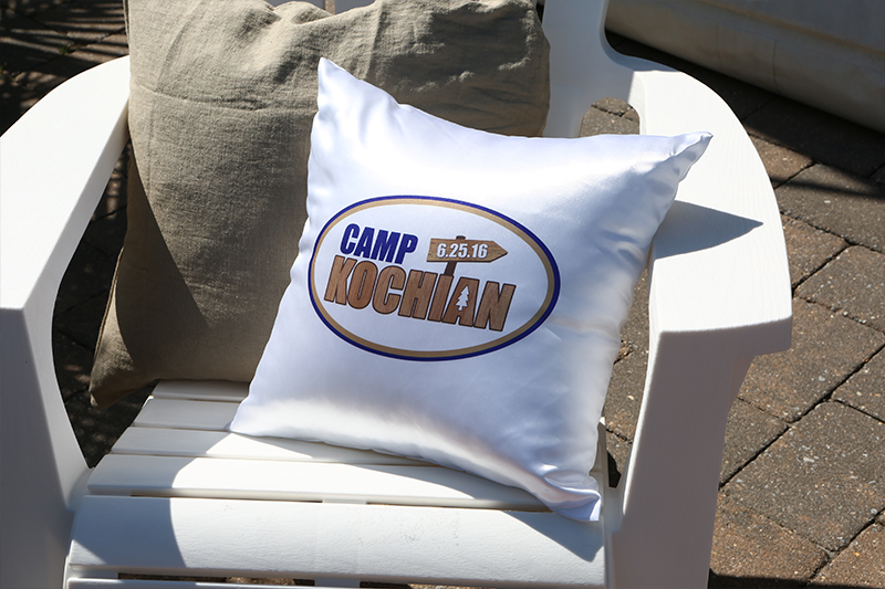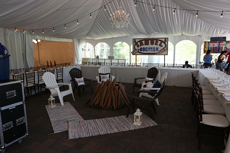 An indoor and outdoor campfire lounge area with adirondack chairs and customized cushions with Samuels logo.