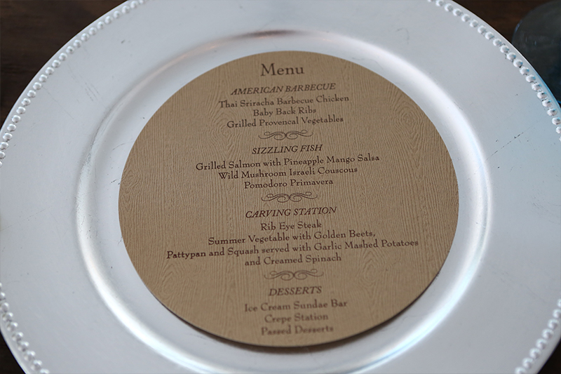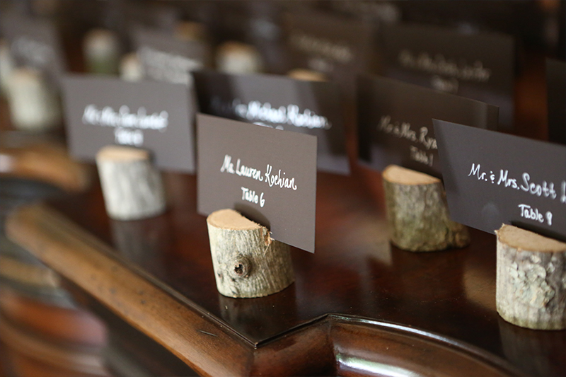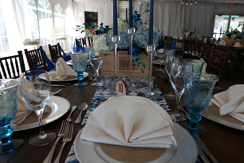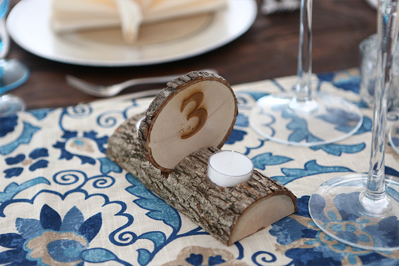 Rustic wooden tables with a blue and white table runners. Table numbers sitting on a miniature wooden log. Blue tapper candles on a long stemmed tea-light candle holder.