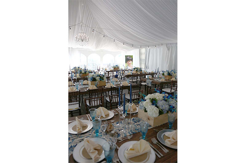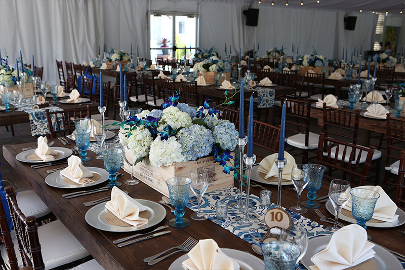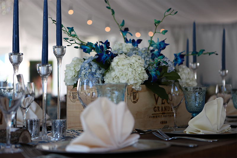 Centerpieces including a blue and white Hydrangea floral arrangement sitting on top of a natural unfinished wooden box.