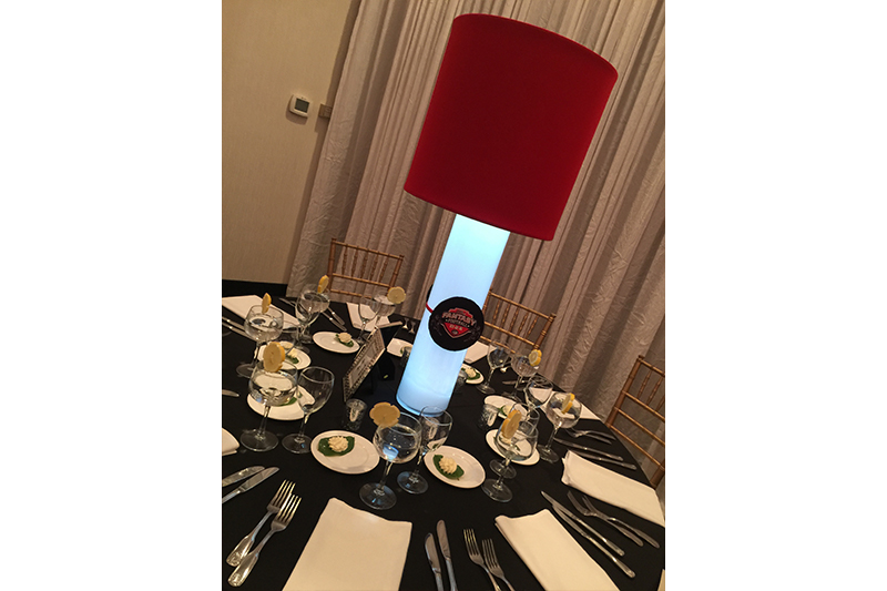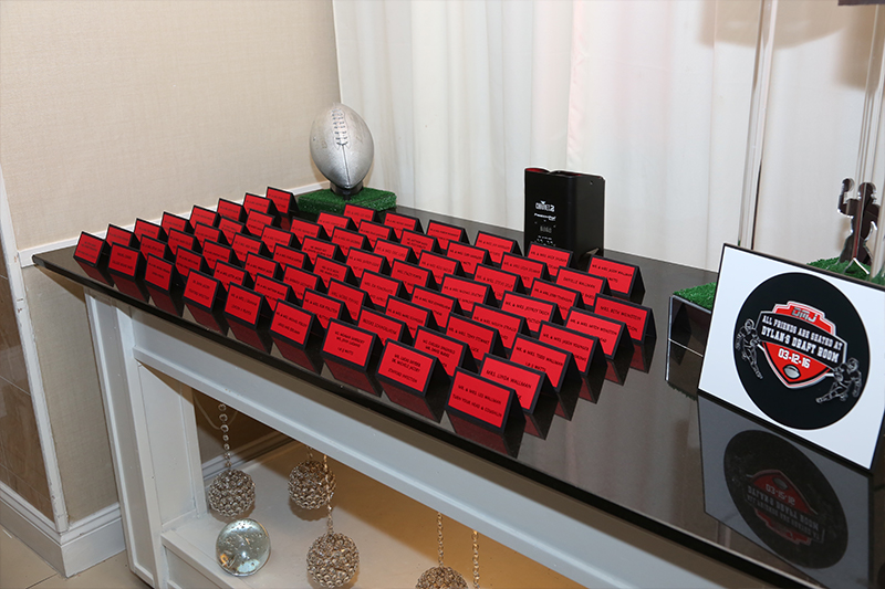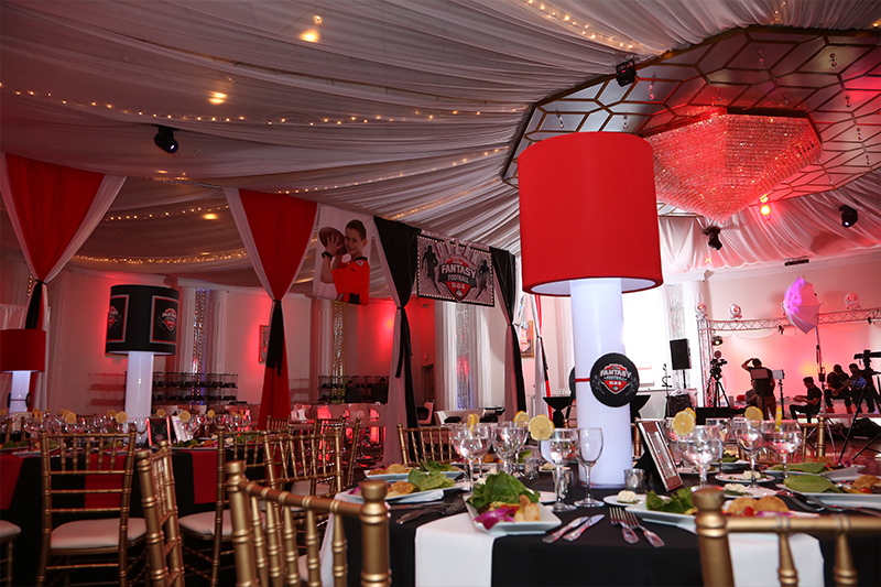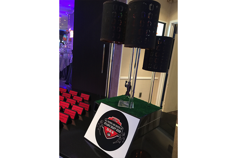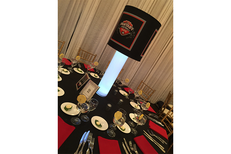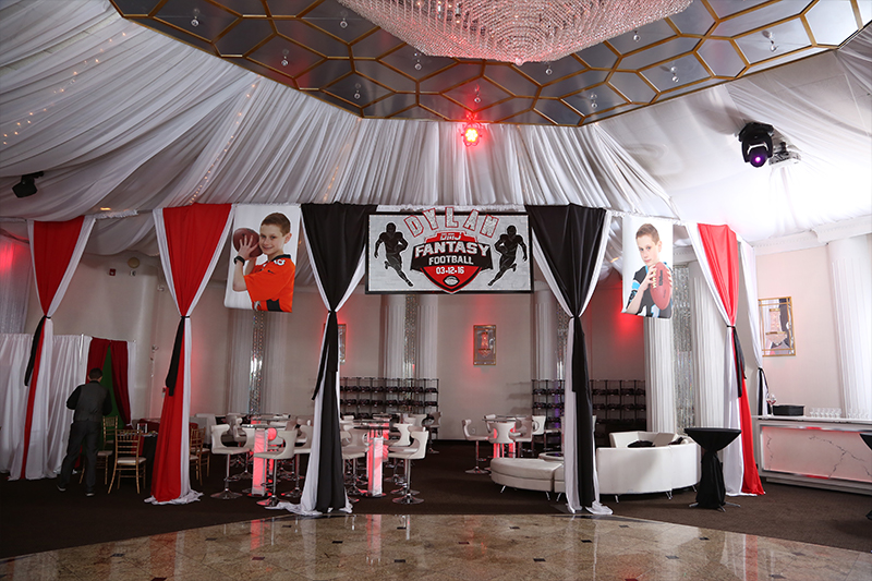 Lighted Themed Backdrop and large photos hanging from lounge canopy