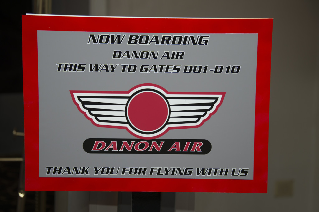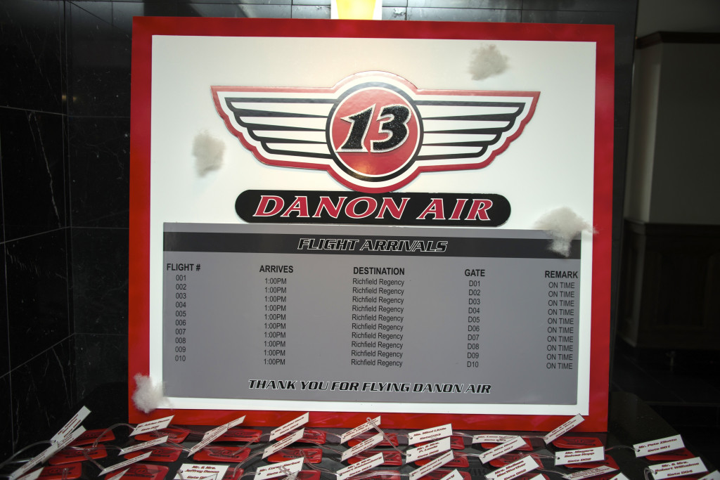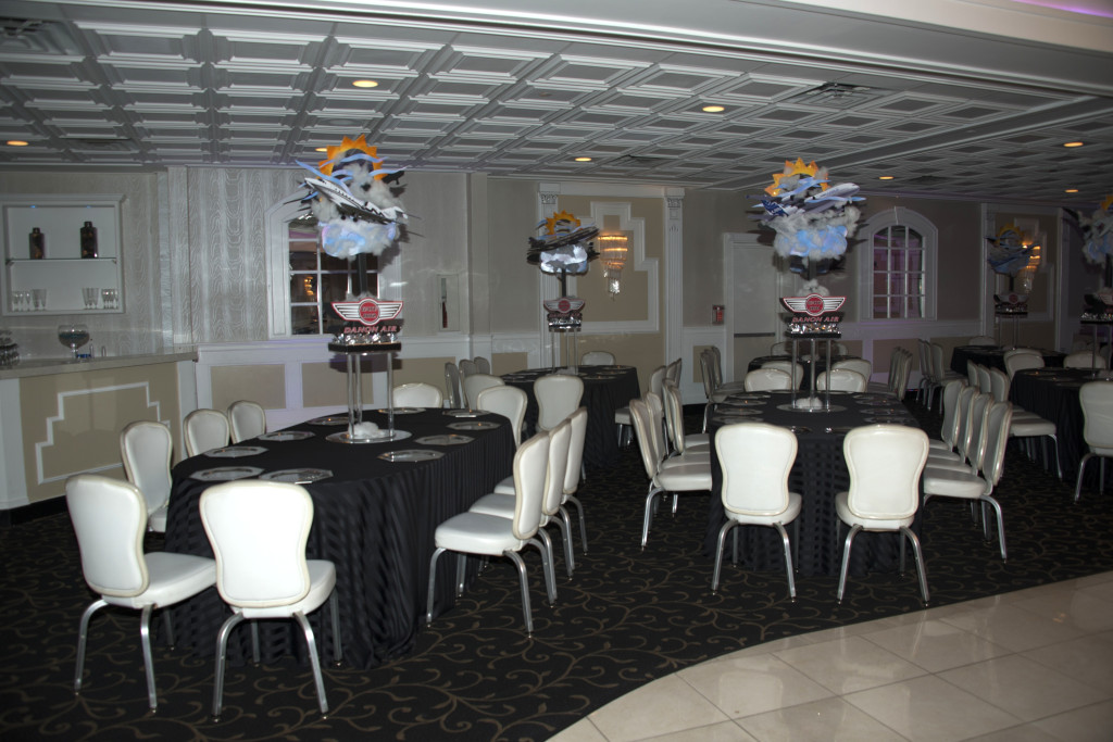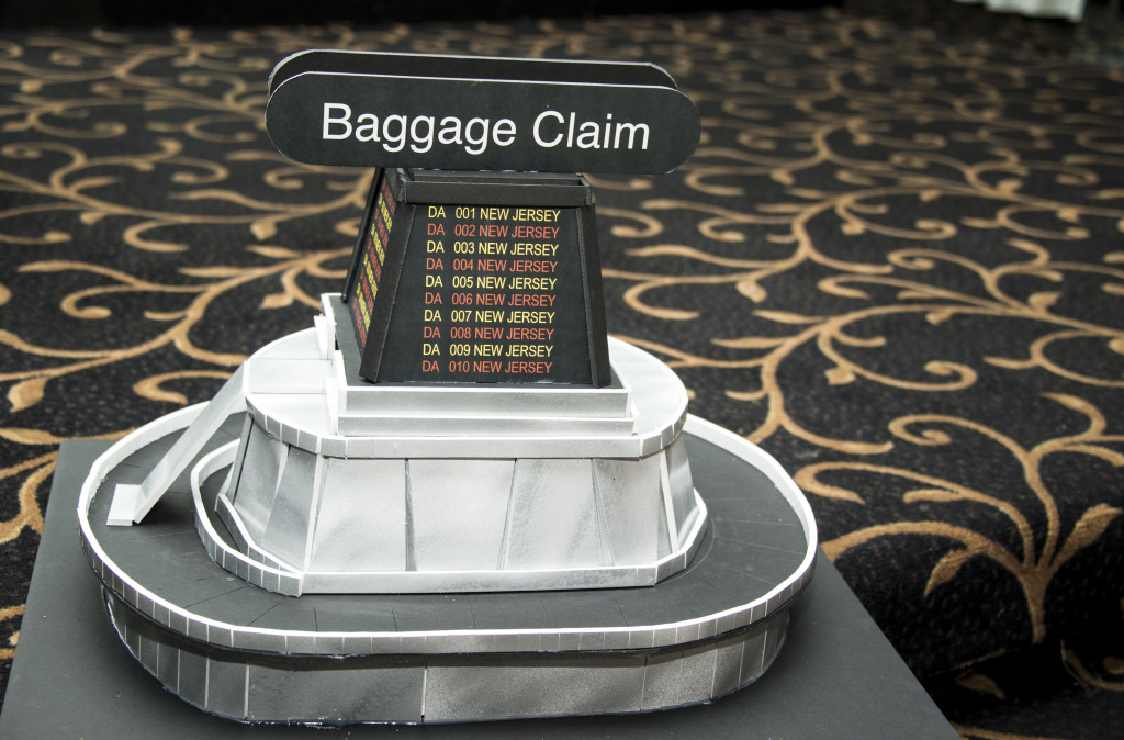 Elliot’s Bar Mitzvah was all about flying. Centerpieces featured different modes of aviation, from military helicopters to commercial jets. At the place card table stood a “Flight Arrivals” board, and guests received luggage tags telling them where to sit. A replica of a baggage claim was used for the candy display.
