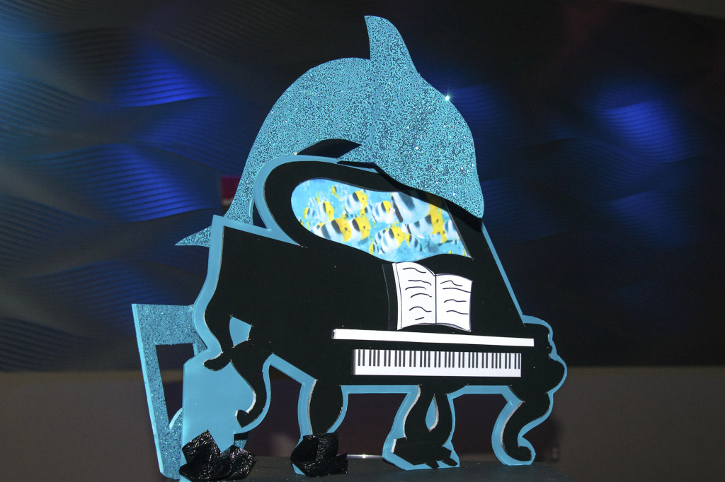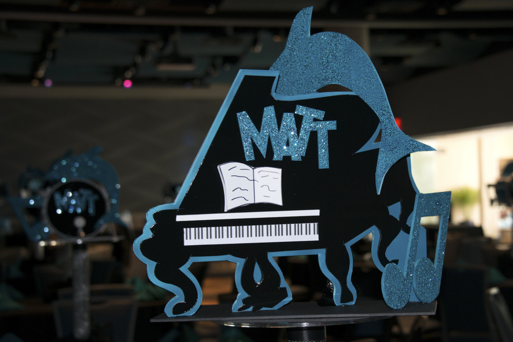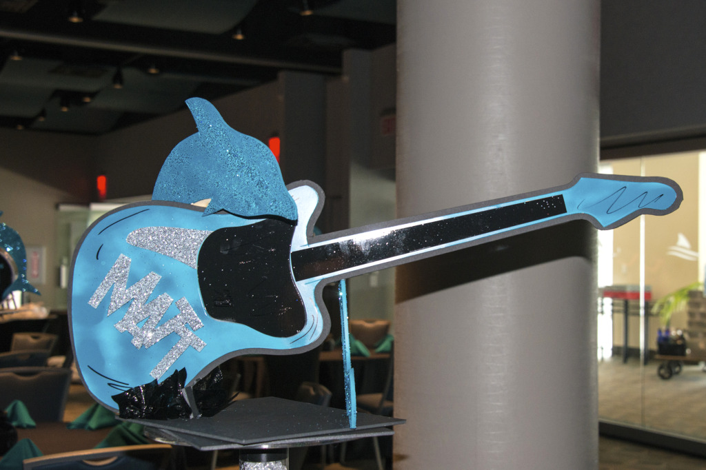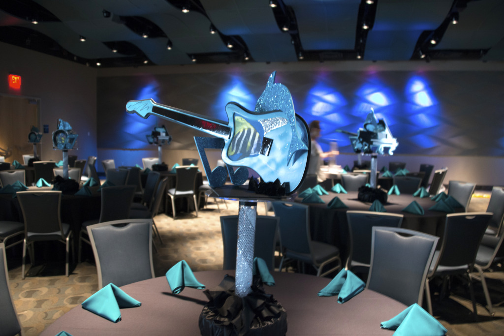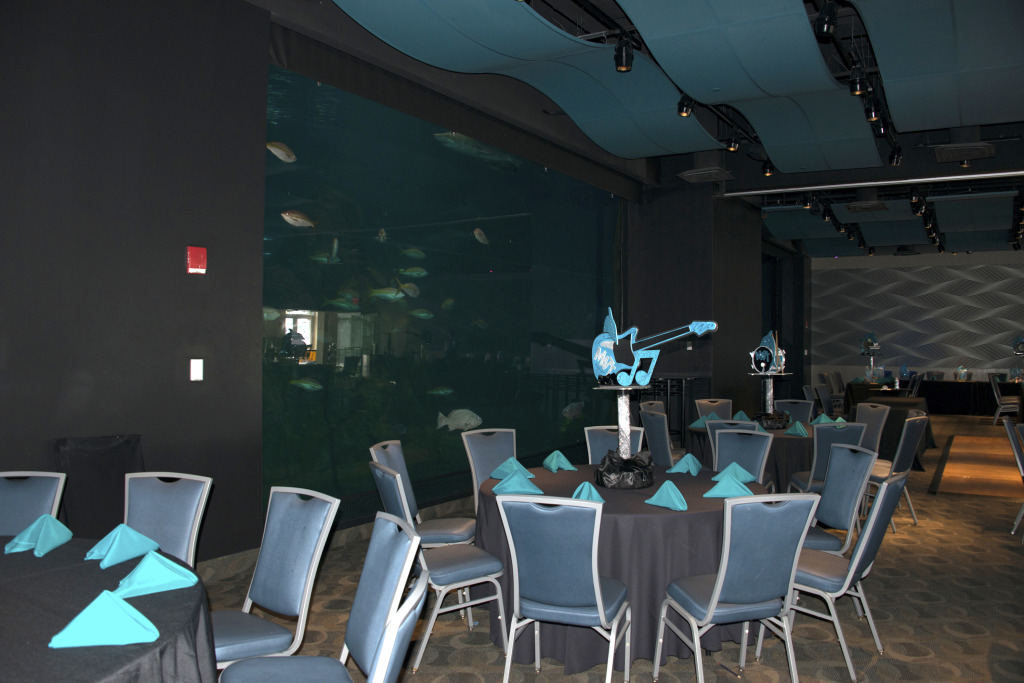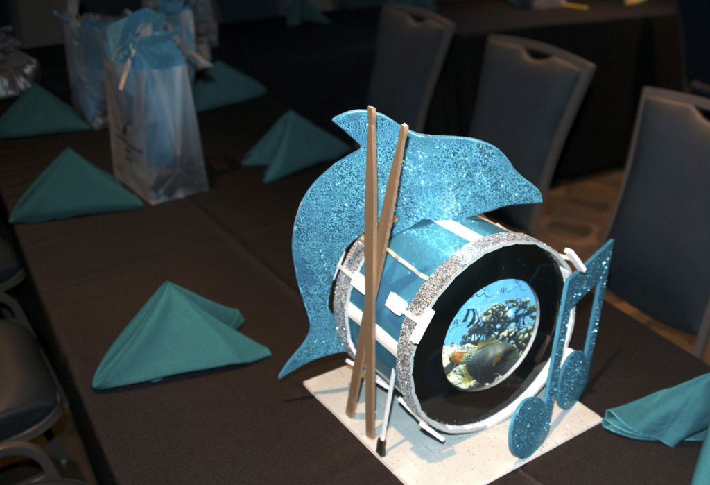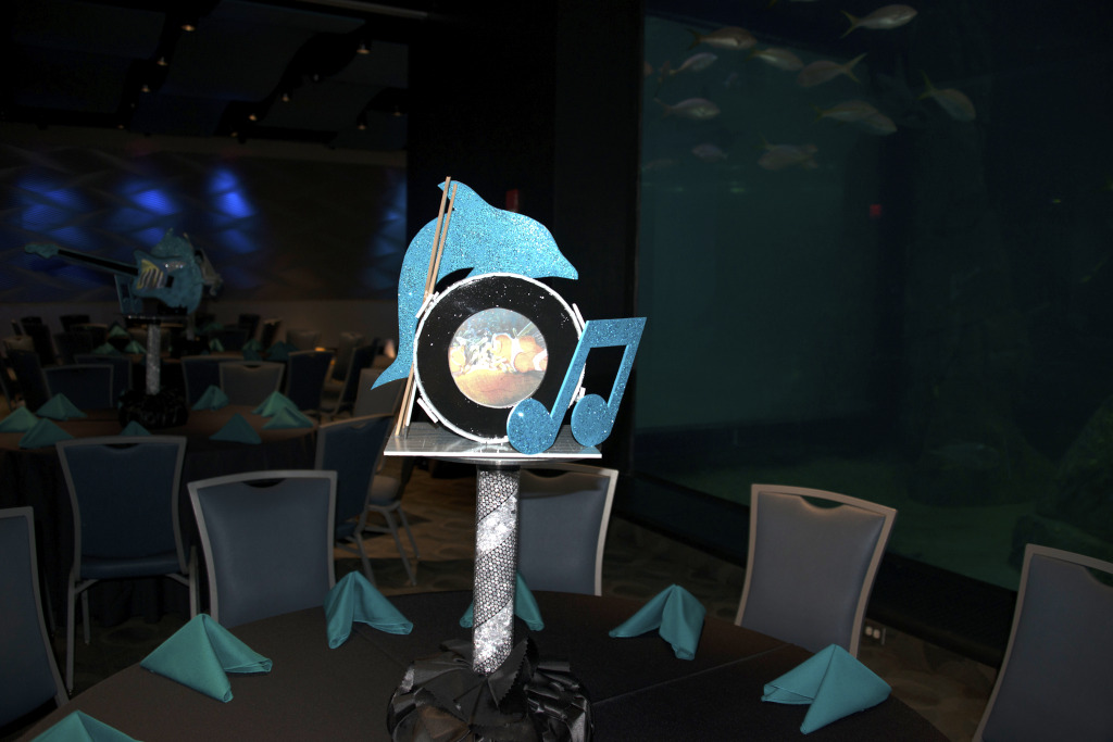 Matt’s Bar Mitzvah theme was Aquarium Rock! We fused Matt’s love of music with the cool backdrop of the Camden Aquarium. Centerpieces featured drums, guitars, and pianos with dolphins, fish and seascapes. A special dais centerpiece featured all three instruments!